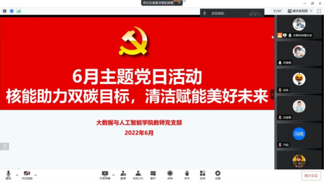 本网讯(图 文/廖华)为深入贯彻学习习近平总书记关于生态文明思想的重要指示精神,引导全体党员同志学习“碳达峰”“碳中和”理念,践行绿色低碳的生活方式,6月26日13:00,大数据学院教师党支部在腾讯会议线开展以“核能助力双碳目标,清洁赋能美好未来”为主题的党日活动。
