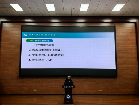 学院各分管领导分别作寒假及开学期间工作安排。其中,李华平副院长就下学期授课准备、专业监测、教改项目申报等作重点安排。唐浩坤副院长主要结合假期毕业设计与毕业实习工作推进、科研项目孵化和申报准备、第二课堂软件设计大赛项目遴选及决赛准备等工作进行部署。刘子菱书记通报了学院2025届毕业生就业工作整体情况以及就业经费使用明细、团队及个人奖励等情况,并详细安排布置寒假期间毕业生实习就业跟进指导和以及访企拓岗,要求老师们要加强学生关怀,深入了解学生当前状况,做到台账清、家底明、指导实,会上还对班导师假期在学生竞赛指导、班级学情分析等方面工作进行安排。最后刘书记结合学校对学院班子抓发展、抓质量、抓队伍、抓落实的总体要求,从学院2026年目标任务、质量跃迁、成果导向、团队赋能等方面指出后学学院努力方向,并勉励老师们同心协力,推进学院高质量发展。