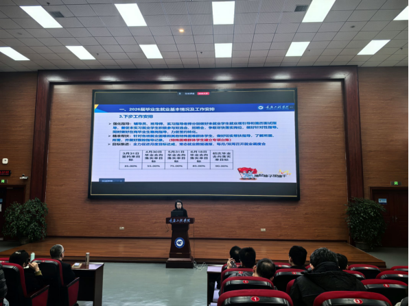 会上,刘子菱书记通报了2026届毕业生就业工作基本情况,明确当前就业形势虽稳中有进,但仍面临诸多挑战,整体态势不容乐观。随后,她围绕就业工作推进过程中的重点难点问题,进行精准把脉、深入剖析,找准问题症结、明确改进方向,并对下一步就业工作进行全面部署,细化工作目标、压实工作责任,明确要求全体教职工在工作中严守工作底线、坚决不越纪律红线。
